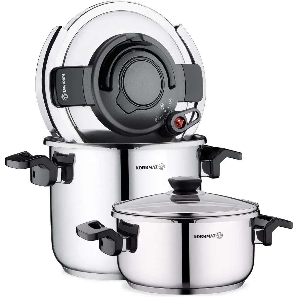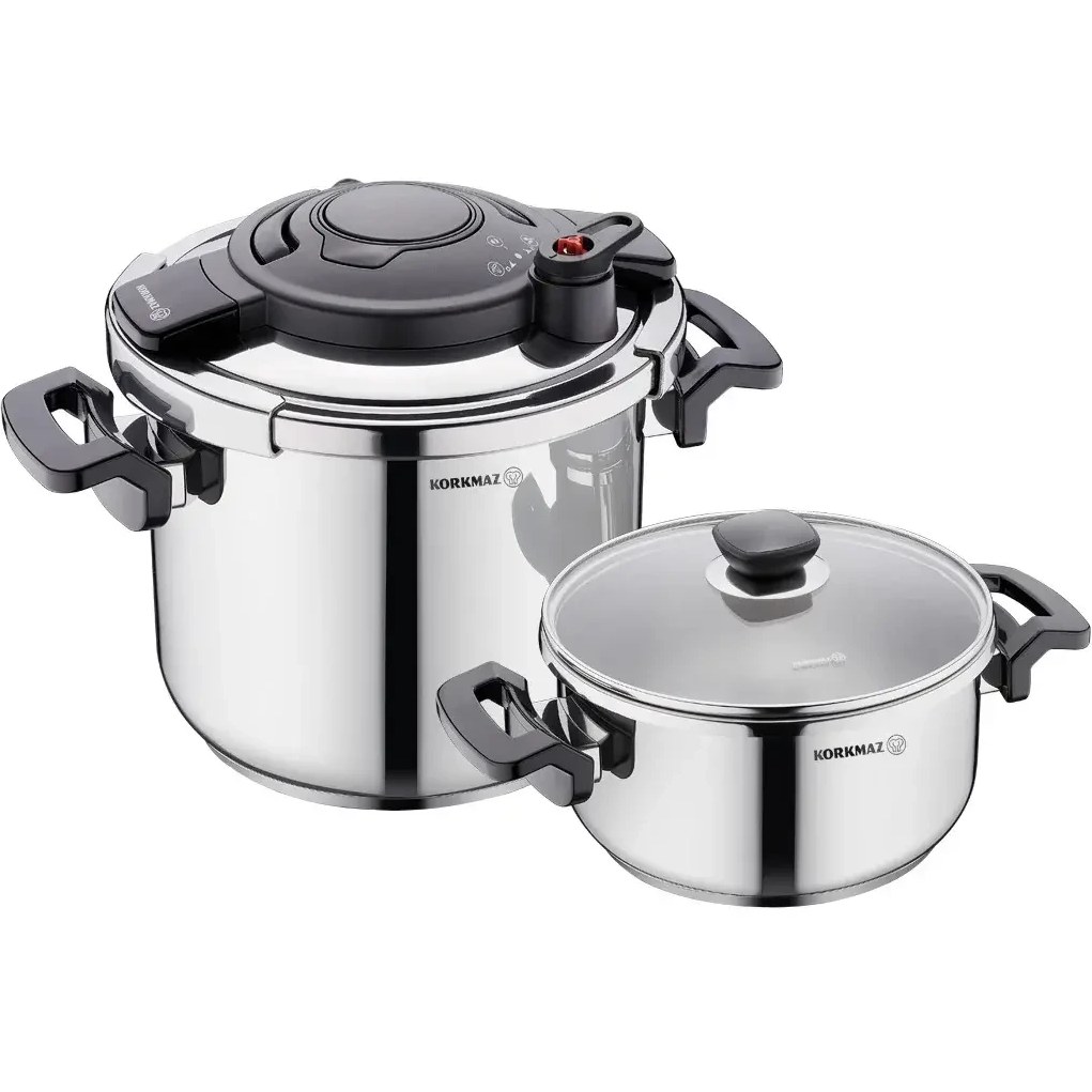 زودپز دوقلو KORKMAZ A178 مدل ALESSA یک ست کاربردی و زیبا از برند کرکماز ترکیه است که با طراحی هوشمندانه، کیفیت ساخت بالا و ایمنی مناسب، انتخابی عالی برای آشپزهای خانگی و حرفهای محسوب میشود.