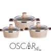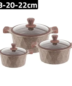 شامل ۳ قابلمه در سایزهای ۱۸، ۲۰ و ۲۲ سانتیمتر + ۳ درب پیرکس مقاوم با سوپاپ خروج بخار
