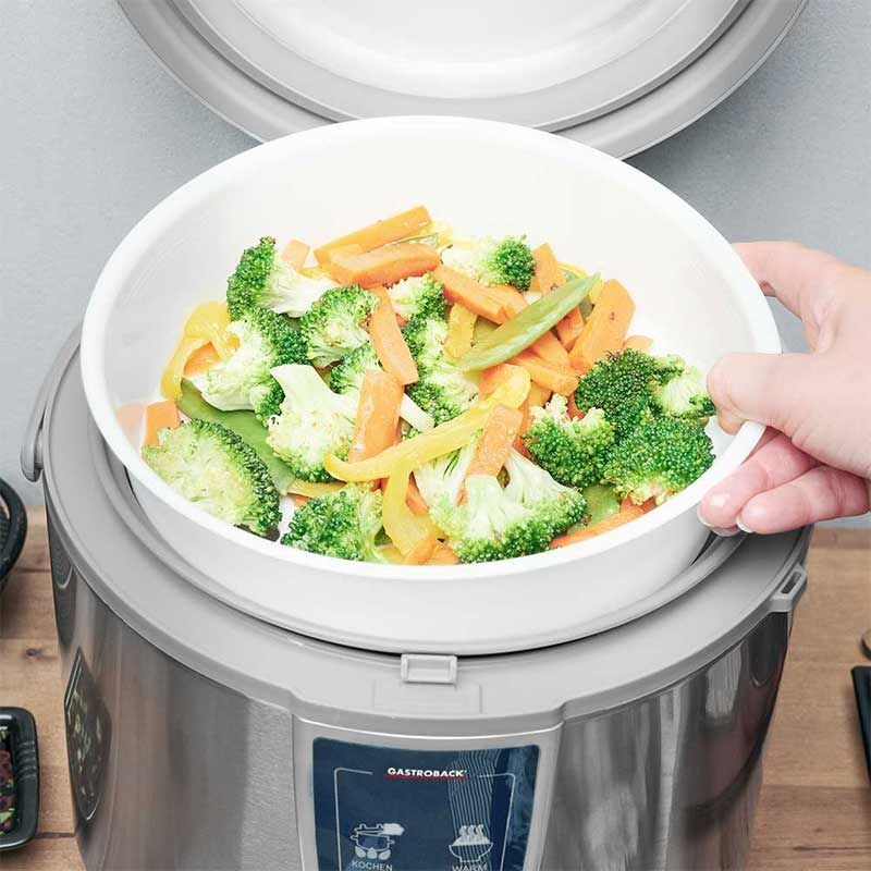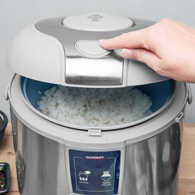 پلوپز گاستروبک مدل 42518 یک دستگاه حرفهای ۶ نفره با توان ۷۰۰ وات، ظرفیت ۵ لیتر و قابلیت بخارپزی است که برای پخت برنج یکنواخت و سریع طراحی شده است.